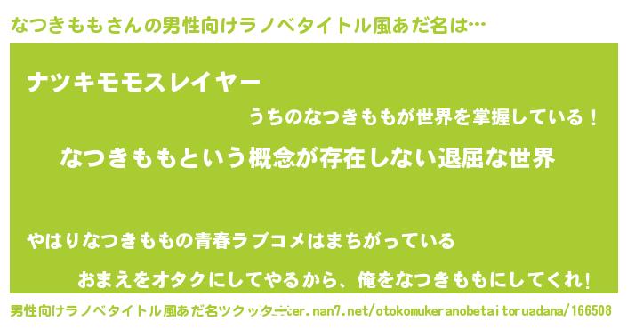 | 女子向けラノベタイトル風あだ名 | 『異世界で失敗しない100のなつきもも』 |