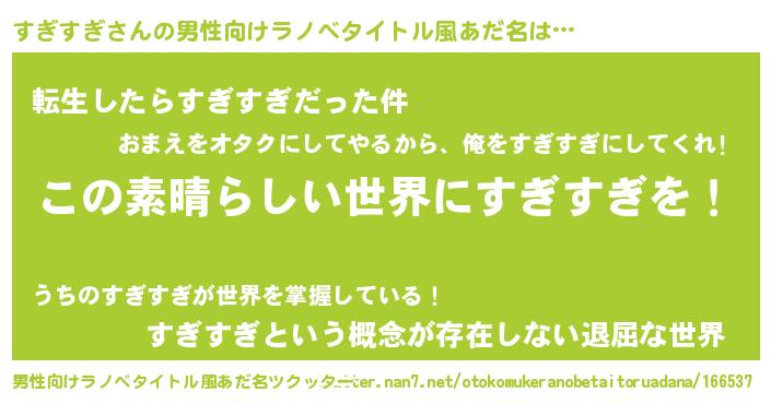 | 胡散臭い通販商品みたいなあだ名 | 『あなたにだけ特別に提供する限定10本のレアな日本酒…その名も「すぎすぎ」』 |