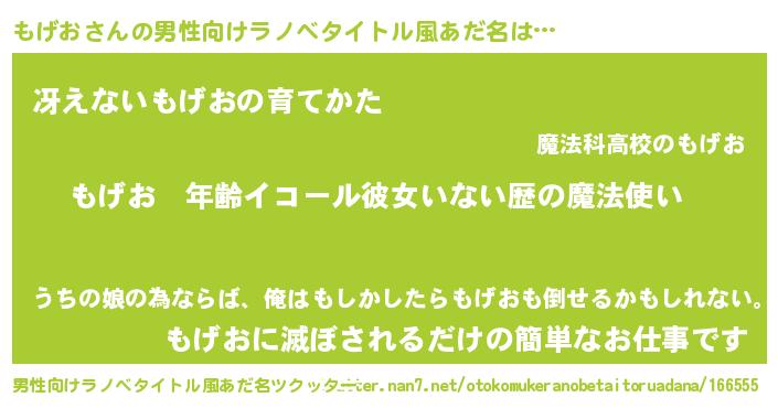 | 女子向けラノベタイトル風あだ名 | 『もげおの玉の輿計画!』 |