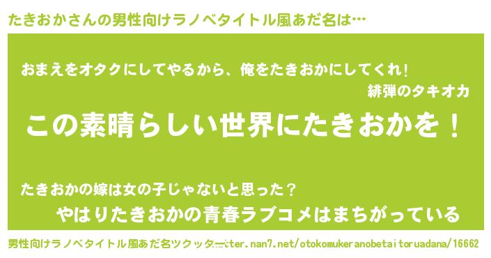 | 女子向けラノベタイトル風あだ名 | 『悪役たきおかに転生したようですが、知った事ではありません』 |