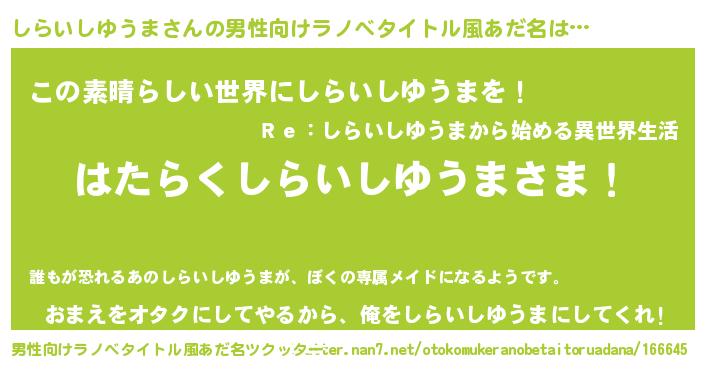 | 欧米人風あだ名 | 『アンジェラ・しらいしゆうま』 |