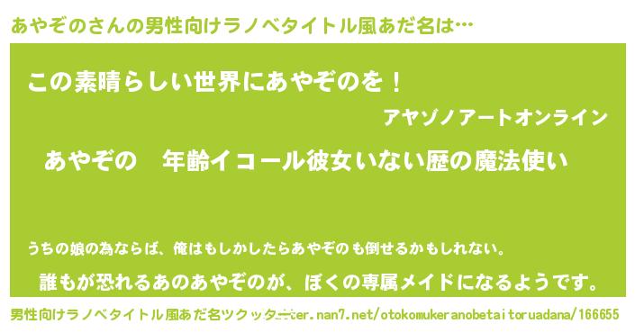 | 胡散臭い通販商品みたいなあだ名 | 『あなたにだけ特別に提供する100年もののヴィンテージワイン…その名も「あやぞの」』 |