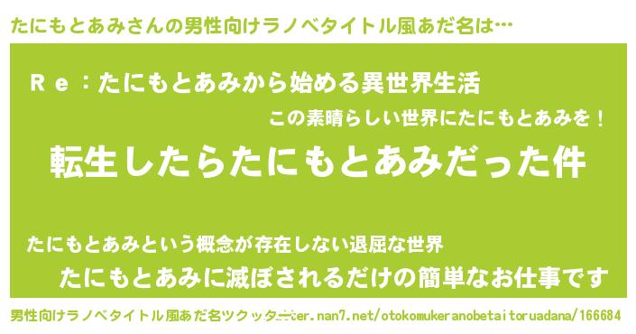 | 女子向けラノベタイトル風あだ名 | 『たにもとあみの玉の輿計画!』 |