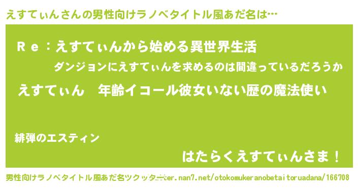 | 女子向けラノベタイトル風あだ名 | 『えすてぃんの玉の輿計画!』 |
