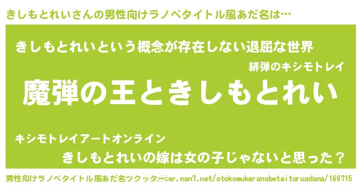 | 女子向けラノベタイトル風あだ名 | 『きしもとれいが死なない童話 林檎のきしもとれいの診療簿』 |