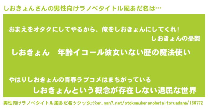 | 女子向けラノベタイトル風あだ名 | 『しおきょんの玉の輿計画!』 |