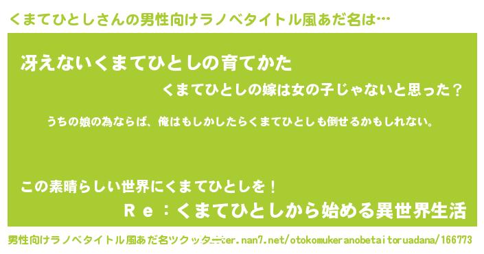 | 女子向けラノベタイトル風あだ名 | 『くまてひとし伯爵の花嫁』 |