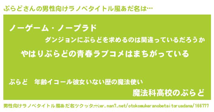 | 女子向けラノベタイトル風あだ名 | 『ぷらど伯爵の花嫁』『ぷらど恋絵巻』 |