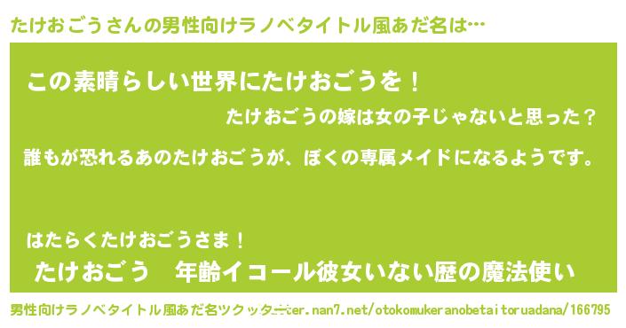 | 女子向けラノベタイトル風あだ名 | 『異世界でカフェたけおごうを開店しました。』 |