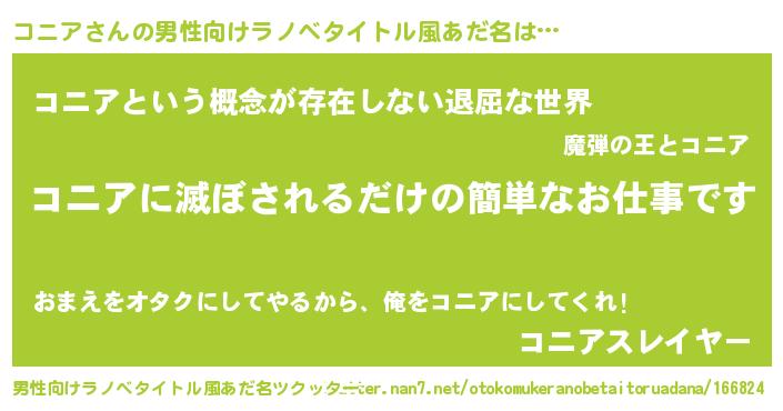 | 胡散臭い通販商品みたいなあだ名 | 『前代未聞の健康食品…その名も「コニア」』 |