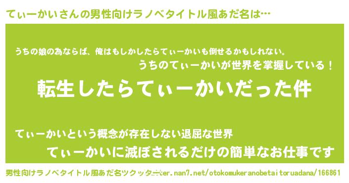 | 女子向けラノベタイトル風あだ名 | 『てぃーかいの玉の輿計画!』 |