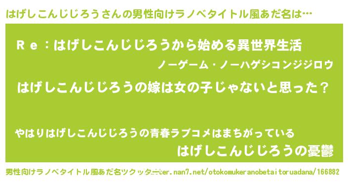 | 女子向けラノベタイトル風あだ名 | 『はげしこんじじろうの卵を拾いまして』 |