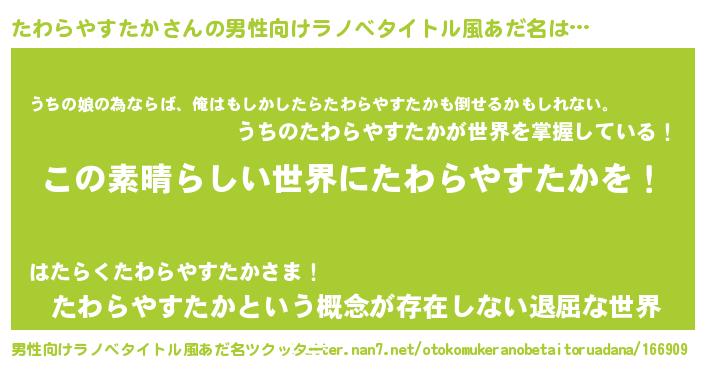 | 女子向けラノベタイトル風あだ名 | 『悪役たわらやすたかに転生したようですが、知った事ではありません』 |