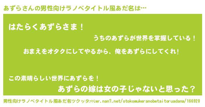 | 女子向けラノベタイトル風あだ名 | 『あずら夫妻のなれそめ』 |