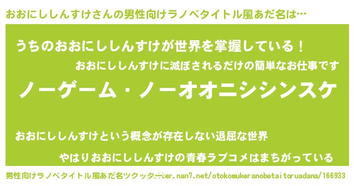 | 女子向けラノベタイトル風あだ名 | 『死神おおにししんすけの再婚』 |