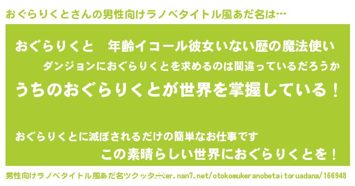| 胡散臭い通販商品みたいなあだ名 | 『あなたにだけ特別に提供する限定10本のレアな日本酒…その名も「おぐらりくと」』 |