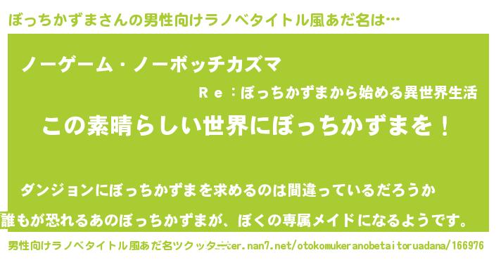 | 女子向けラノベタイトル風あだ名 | 『悪役ぼっちかずまに転生したようですが、知った事ではありません』 |
