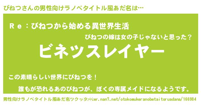 | 意味不明あだ名 | 『エリンギ科びねつ属』『自称びねつ』 |