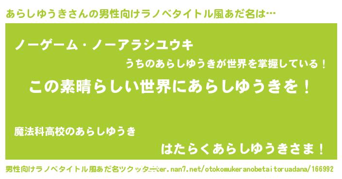 | 女子向けラノベタイトル風あだ名 | 『乙女ゲームの破滅フラグしかない悪役あらしゆうきに転生してしまった…』 |