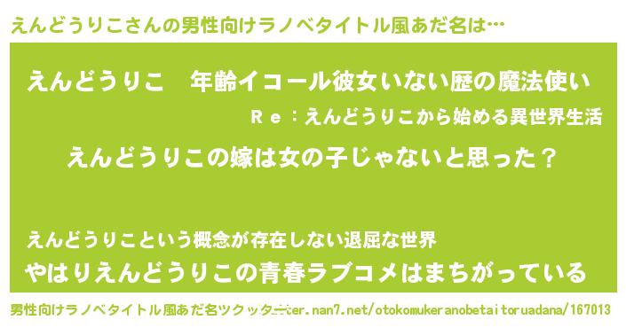 | 女子向けラノベタイトル風あだ名 | 『えんどうりこの卵を拾いまして』 |