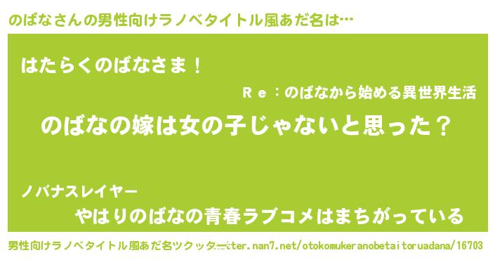 | 女子向けラノベタイトル風あだ名 | 『のばな様がみてる』『のばな伯爵の花嫁』 |