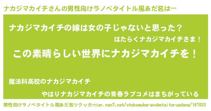 | 女子向けラノベタイトル風あだ名 | 『悪役ナカジマカイチに転生したようですが、知った事ではありません』 |