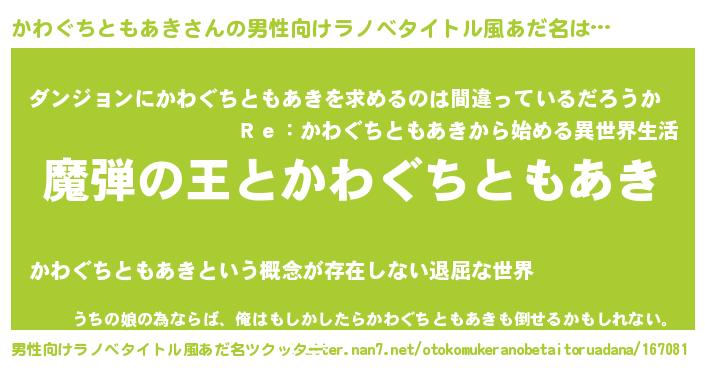 | 意味不明あだ名 | 『住所不定無職かわぐちともあき(4歳)』 |