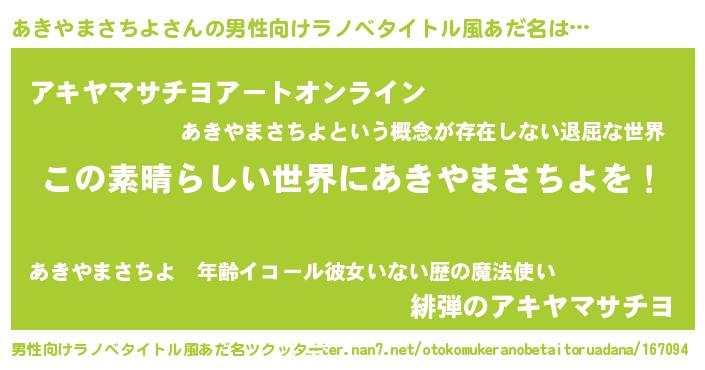 | 女子向けラノベタイトル風あだ名 | 『乙女ゲームの破滅フラグしかない悪役あきやまさちよに転生してしまった…』 |