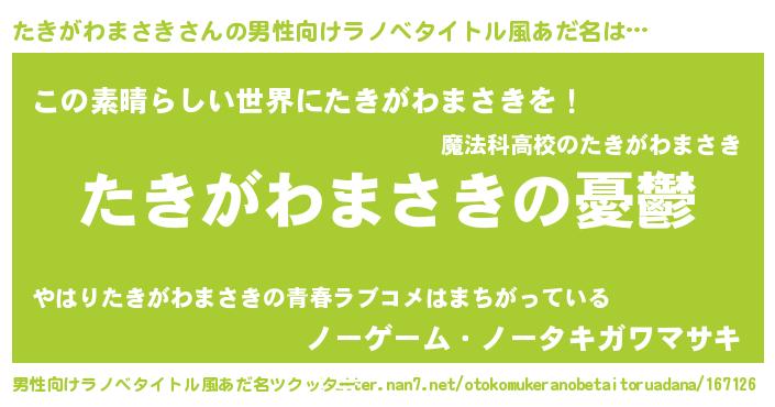 | 女子向けラノベタイトル風あだ名 | 『(仮)たきがわまさきのやんごとなき事情』 |