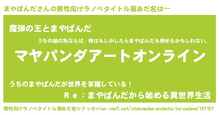 | 胡散臭い通販商品みたいなあだ名 | 『モテモテ間違いなし霊験あらたかなお札…その名も「まやぱんだ」』 |
