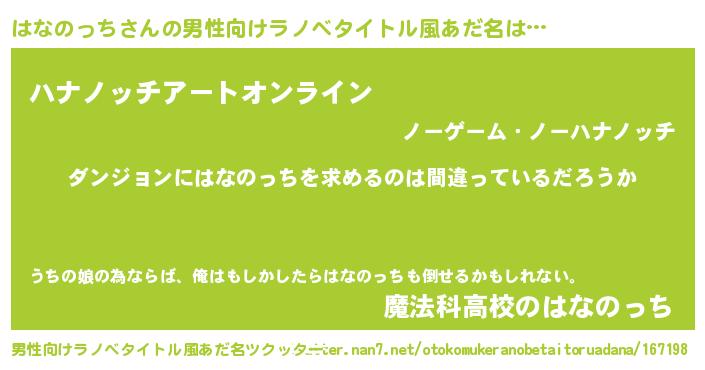 | 女子向けラノベタイトル風あだ名 | 『はなのっちの卵を拾いまして』 |
