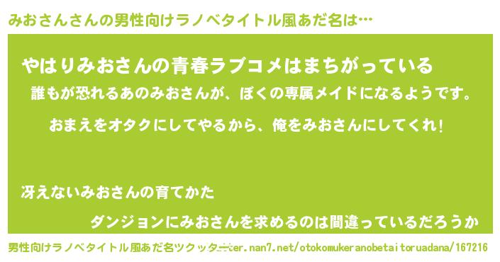 | 女子向けラノベタイトル風あだ名 | 『みおさん夫妻のなれそめ』 |