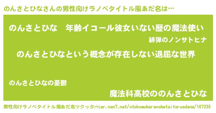 | 女子向けラノベタイトル風あだ名 | 『異世界で失敗しない100ののんさとひな』 |