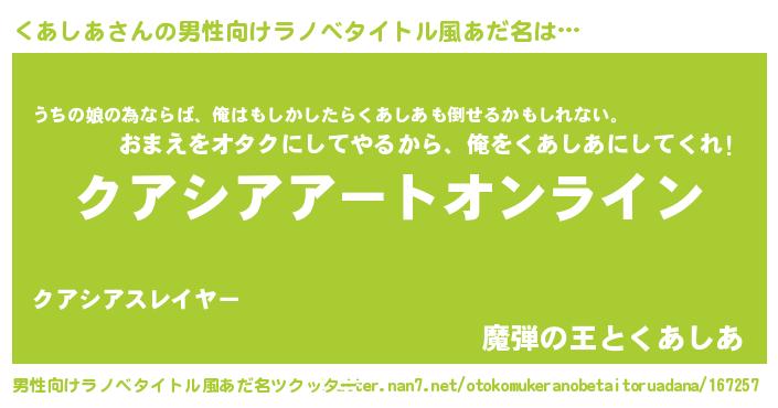 | 胡散臭い通販商品みたいなあだ名 | 『億万長者になれる霊験あらたかなお札…その名も「くあしあ」』 |