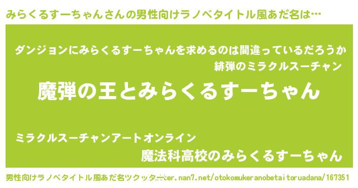 | 女子向けラノベタイトル風あだ名 | 『みらくるすーちゃんが死なない童話 林檎のみらくるすーちゃんの診療簿』 |