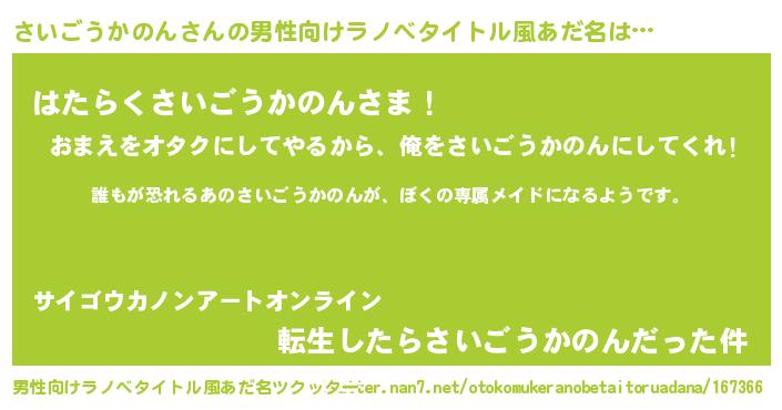| 女子向けラノベタイトル風あだ名 | 『さいごうかのんの契約王妃』 |