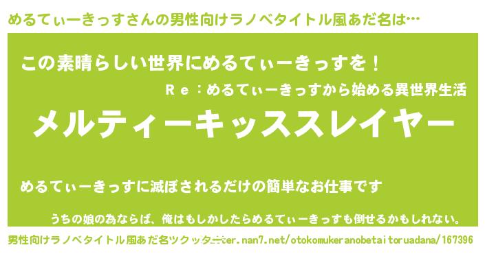 めるてぃーきっすさんの男性向けラノベタイトル風あだ名をツクッター!
