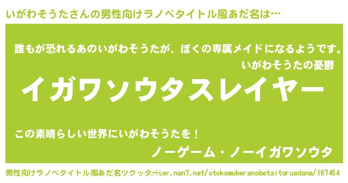 | 胡散臭い通販商品みたいなあだ名 | 『絶対に幸福をもたらす健康食品…その名も「いがわそうた」』 |
