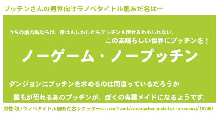 | 女子向けラノベタイトル風あだ名 | 『死神プッチンの再婚』 |