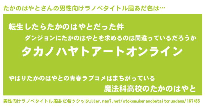 | ヒーロー風カッコイイあだ名 | 『スーパータカノハヤト』『黄金騎士タカ』 |