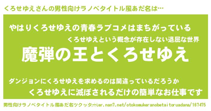 | 女子向けラノベタイトル風あだ名 | 『くろせゆえが死なない童話 林檎のくろせゆえの診療簿』 |