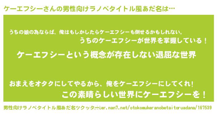 | 女子向けラノベタイトル風あだ名 | 『異世界で失敗しない100のケーエフシー』 |
