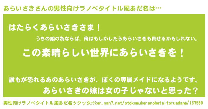 | 胡散臭い通販商品みたいなあだ名 | 『あなたにだけ特別に提供する世界で10本だけ現存している希少なブランデー…その名も「あらいさき」』 |