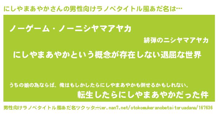 | 胡散臭い通販商品みたいなあだ名 | 『絶対に幸福をもたらす健康食品…その名も「にしやまあやか」』 |