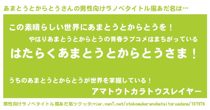 | 意味不明あだ名 | 『住所不定無職あまとうとからとう(86歳)』 |