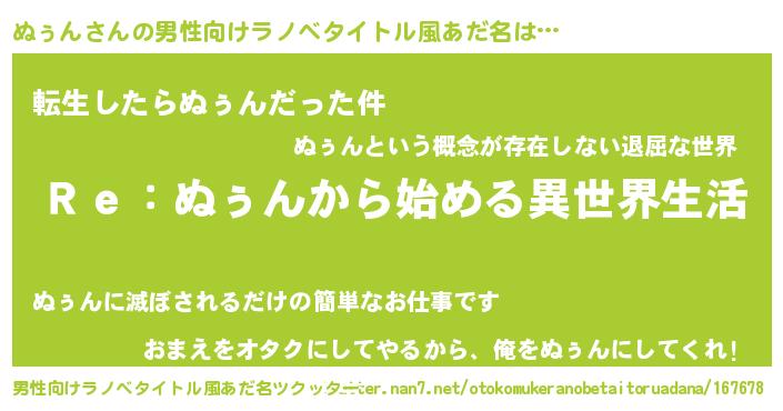 | 意味不明あだ名 | 『自称ぬぅん』『もやし科ぬぅん属』 |