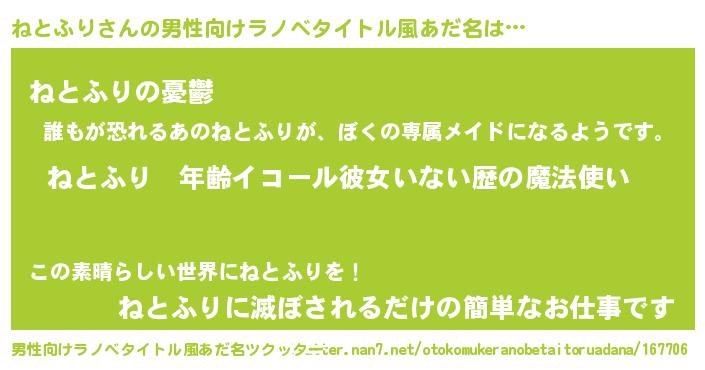 | 女子向けラノベタイトル風あだ名 | 『ねとふりの玉の輿計画!』 |