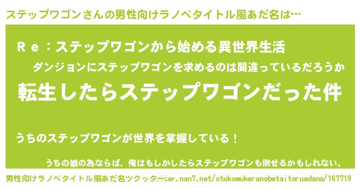 | 女子向けラノベタイトル風あだ名 | 『ステップワゴンの玉の輿計画!』 |