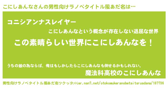 | 女子向けラノベタイトル風あだ名 | 『乙女ゲームの破滅フラグしかない悪役こにしあんなに転生してしまった…』 |