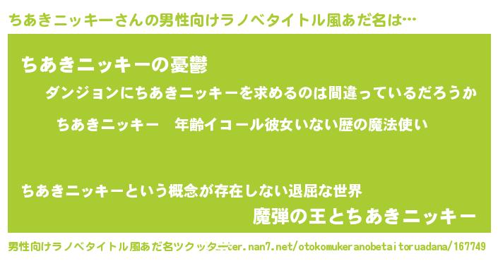 | 女子向けラノベタイトル風あだ名 | 『ちあきニッキーの玉の輿計画!』 |